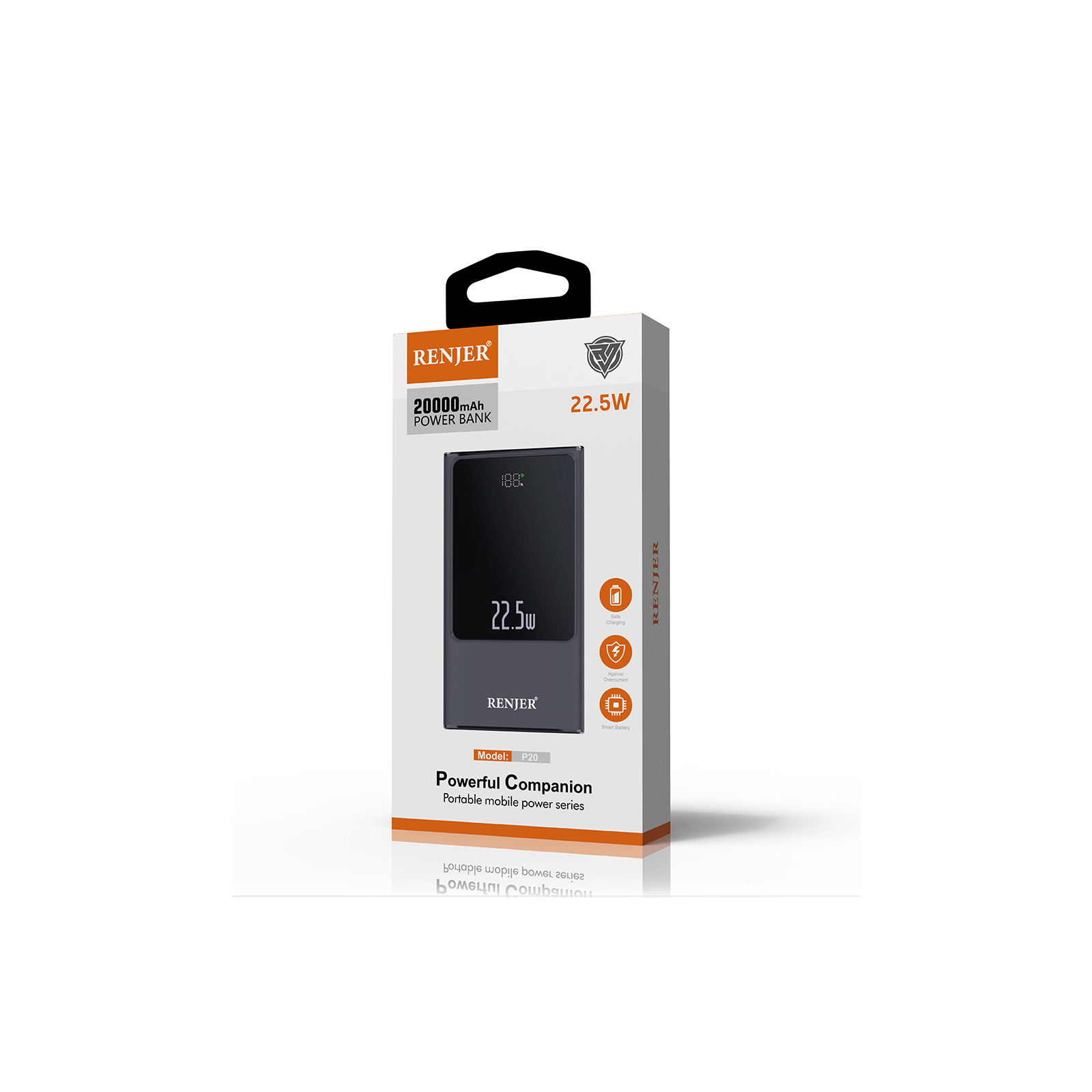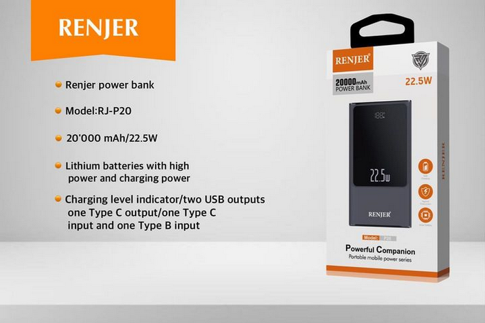 پاوربانک فست شارژ 20000 میلی آمپر مدل Renjer RJ-P20PD QC 3.0 یک پاوربانک با ظرفیت بالا و قابلیت شارژ سریع برای دستگاههایی است که از تکنولوژی شارژ سریع PD QC 3.0 پشتیبانی میکنند، از جمله تلفنهای همراه، تبلتها و دستگاههای دیگر.