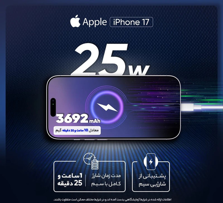 مشخصات باتری : امکان ۵۰ درصد شارژ در ۳۰ دقیقه / امکان شارژ با توان ۲۵ وات به صورت بیسیم (از راه MagSafe)/ امکان شارژ با توان ۱۵ وات به صورت بیسیم (از راه شارژرهای بیسیم سازگار با تکنولوژی Qi۲) / امکان شارژ معکوس با توان ۴.۵ وات به صورت با سیم