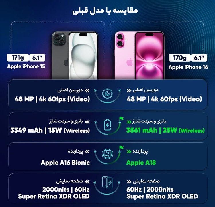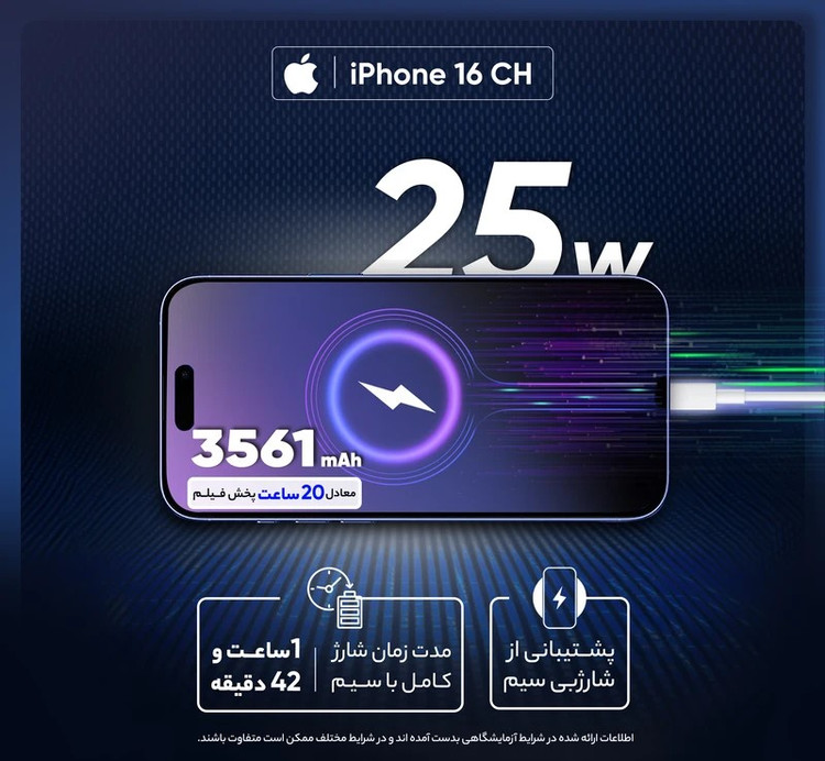 مشخصات باتری : امکان ۵۰ درصد شارژ در ۳۰ دقیقه / امکان شارژ با توان ۲۵ وات به صورت بیسیم (از راه MagSafe)/ امکان شارژ با توان ۱۵ وات به صورت بیسیم (از راه شارژرهای بیسیم سازگار با تکنولوژی Qi۲) / امکان شارژ معکوس با توان ۴.۵ وات به صورت با سیم